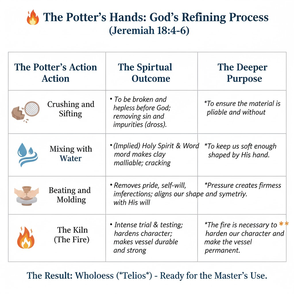 • Ready for the Master’s Use: When the process is complete, the vessel is ready. It is durable, beautiful, and able to hold the Master’s liquid. Our character, forged in the fire of affliction, makes us fit to fulfill the divine purpose God has designed for us.